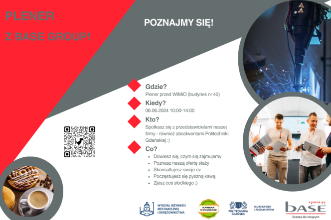 Serdecznie zapraszamy wszystkich studentów i absolwentów na wyjątkowe wydarzenie z cyklu „Kariera w Plenerze”, organizowane przez firmę Base Group wspólnie z Wydziałem Inżynierii Mechanicznej i Okrętownictwa oraz Biurem Karier Politechniki Gdańskiej. Spotkanie odbędzie się 6 czerwca 2024 r. (czwartek) w godzinach 10:00 – 14:00 przed budynkiem Wydziału Inżynierii Mechanicznej i Okrętownictwa (budynek nr 40).