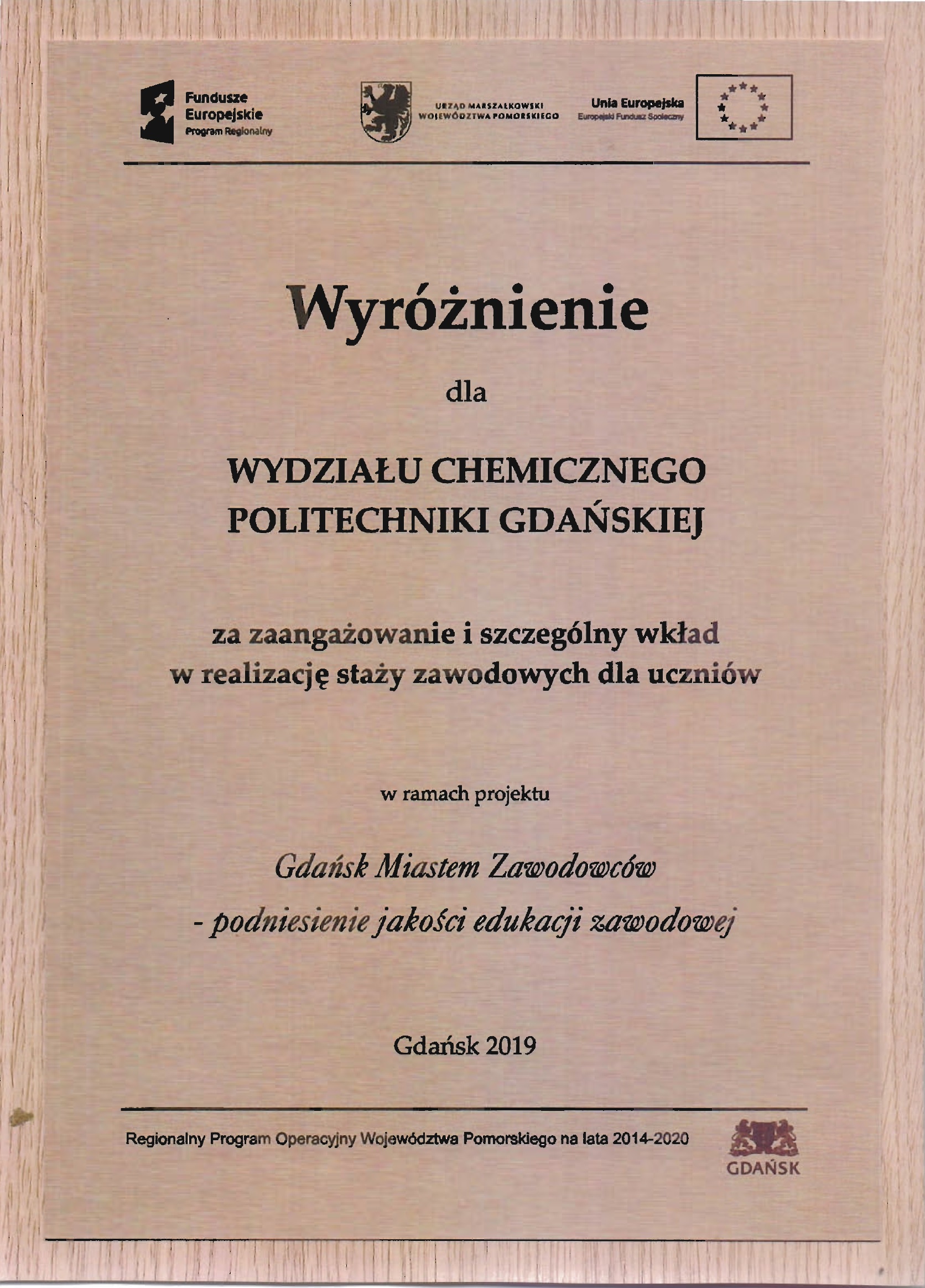 - 2019 – The Chemical Faculty received a distinction awarded for its commitment and special contribution to the implementation of professional internships for students under the project "Gdańsk as a Professionals' City - Improving the quality of vocational education" ("Gdańsk Miastem Zawodowców – podniesienie jakości edukacji zawodowej"). The project is implemented as part of the Regional Operational Program in 2014-2020.
